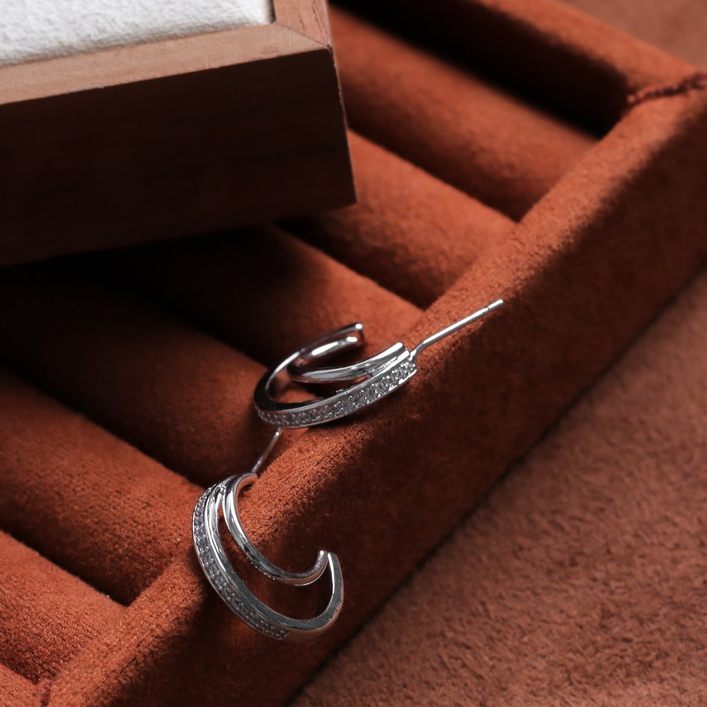 Ag-1652-Rd Brinco Meia Argola Dupla Lisa E Cravejada Cristal - Ródio Branco.