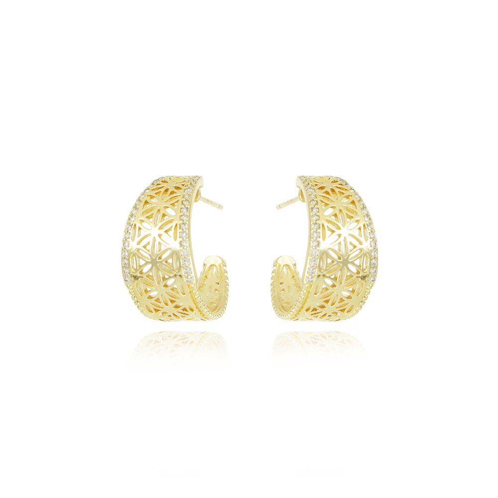 Encante-se com esse brinco!Este lindo brinco MEIA ARGOLA DETALHADA CRAVEJADA DE ZIRCÔNIAS CRISTAIS é feito com LATÃO BANHADO A OURO 18K de alta qualidade.