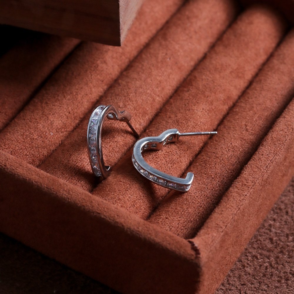 Ag-1786-Rd Brinco Meia Argola De Coração Cravejado - Ródio Branco.