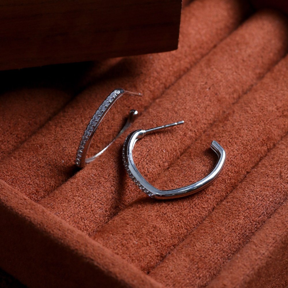 Ag-1787-Rd Brinco Meia Argola Cravejado De Zircônias Cristais - Ródio Branco.