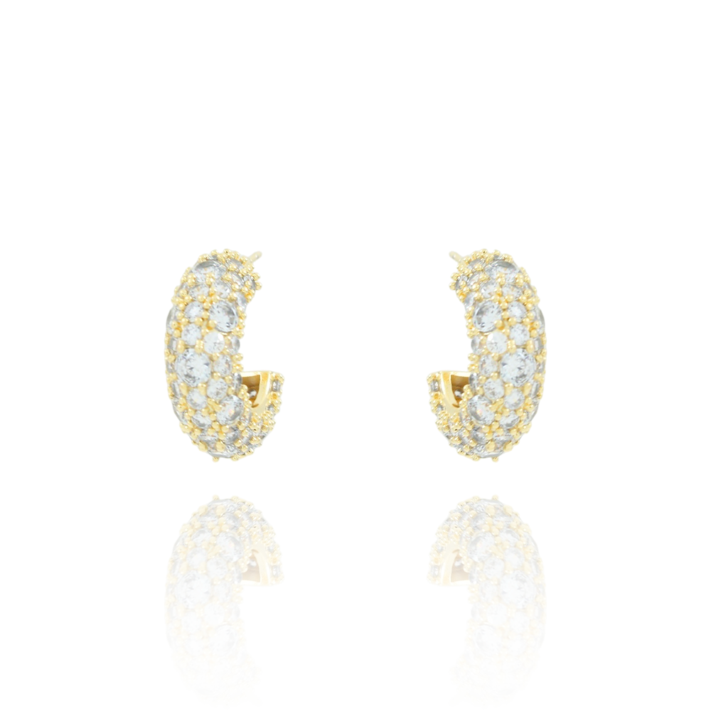 Encante-se com esse brinco!Este lindo brinco MEIA ARGOLA CRAVEJADO DE ZIRCÔNIAS CRISTAIS é feito com LATÃO BANHADO A OURO 18K de alta qualidade.