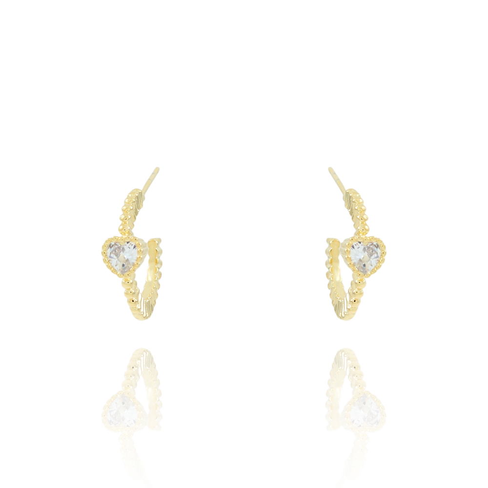 Encante-se com esse brinco!Este lindo brinco MEIA ARGOLA DETALHADA COM CORAÇÃO CRISTAL é feito com LATÃO BANHADO A OURO 18K de alta qualidade.