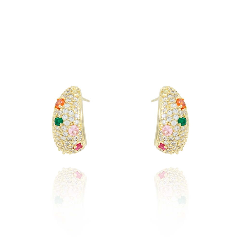 Encante-se com esse brinco!Este lindo brinco MEIA ARGOLA CRAVEJADO COLORIDO é feito com LATÃO BANHADO A OURO 18K de alta qualidade.