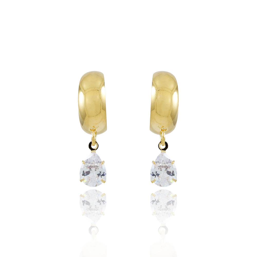 Encante-se com esse brinco!Este lindo brinco MEIA ARGOLA COM PÊNDULO DE GOTA CRISTAL é feito com LATÃO BANHADO A OURO 18K de alta qualidade.