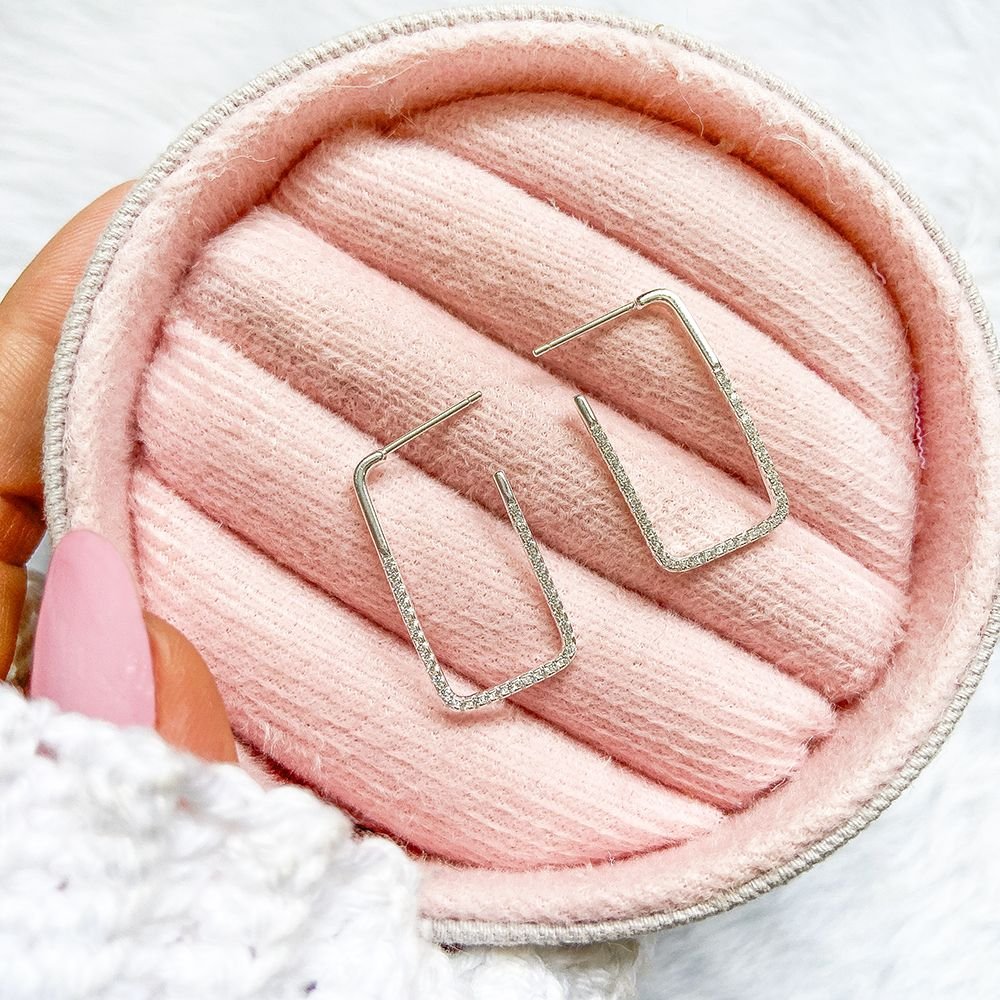 Ag-Br-1137 Brinco Meia Argola Quadrada Cravejado Cristal