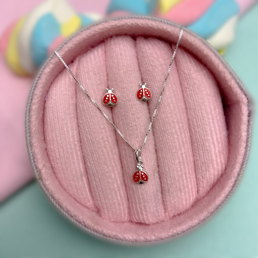Encante-se com esse conjunto!Este lindo conjunto INFANTIL DE JOANINHA é feito com PRATA 925 de alta qualidade.