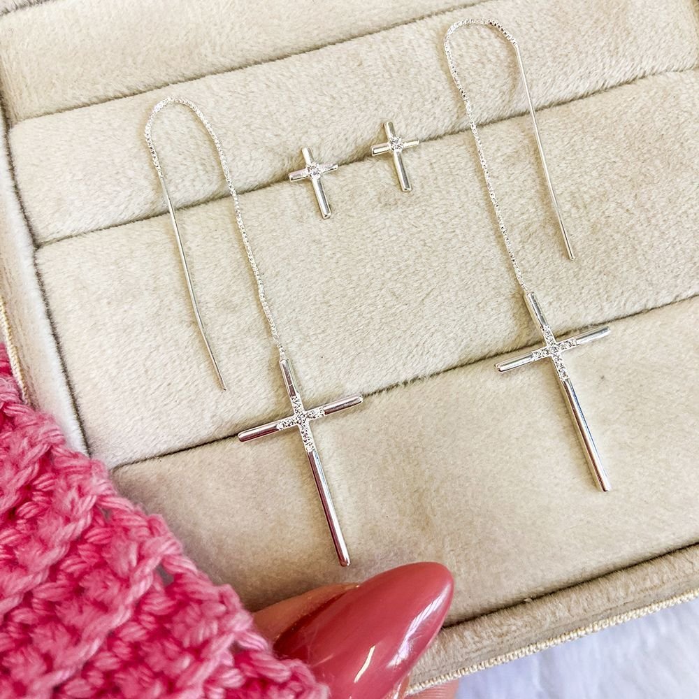 Ag-Duplo-27 Brinco Duplo De Prata 925 Cruz Cravejada De Zircônias Cristal.