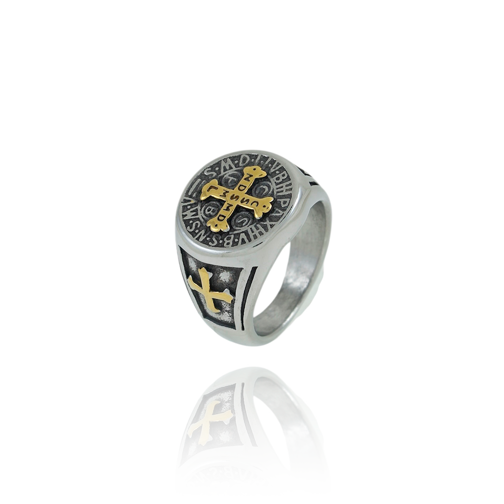 Encante-se com esse anel!Este lindo anel SÃO BENTO MASCULINO é feito com AÇO INOXIDÁVEL + AÇO INOX DOURADO de alta qualidade.