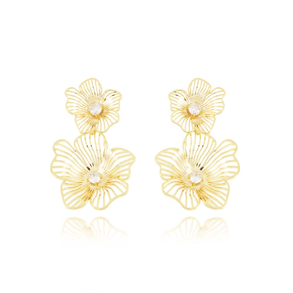 Encante-se com esse brinco!Este lindo brinco FLOR LONGO CRAVEJADO DE ZIRCÔNIA CRISTAL é feito com LATÃO BANHADO A OURO 18K de alta qualidade.