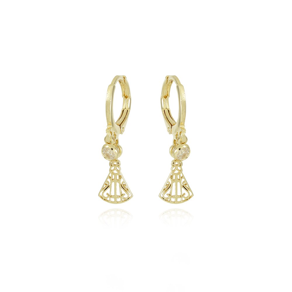 Encante-se com esse brinco!Este lindo brinco DE ARGOLA ARTICULADA COM PINGENTE DE NOSSA SENHORA E ZIRCÔNIA é feito com LATÃO BANHADO A OURO 18K de alta qualidade.