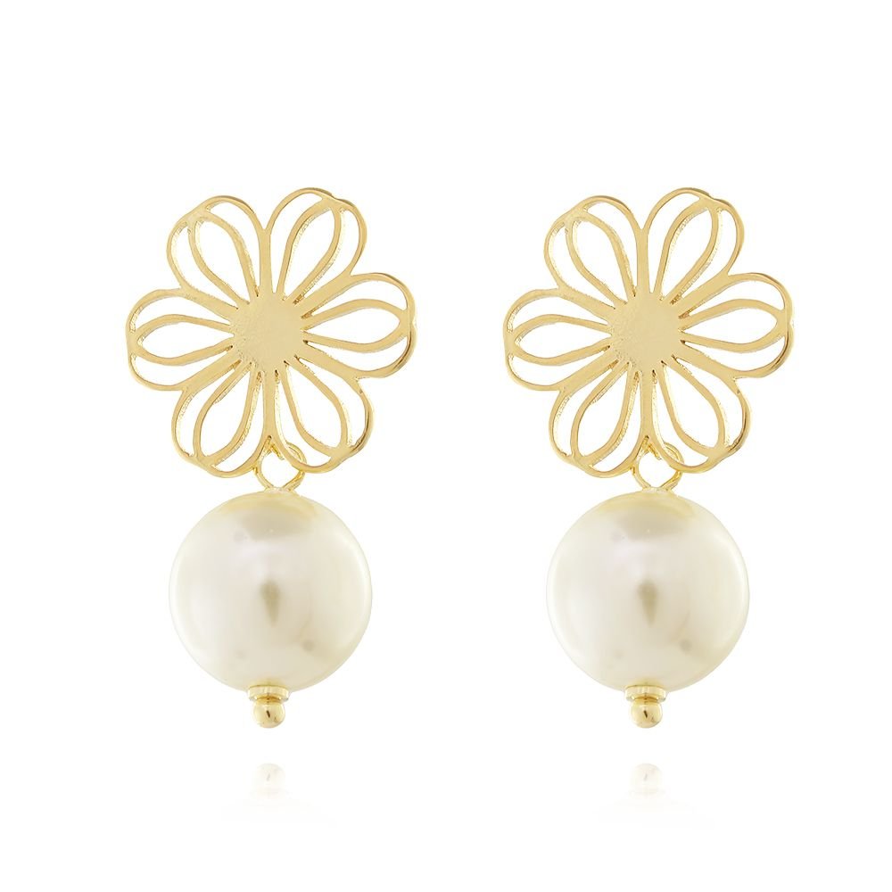 Encante-se com esse brinco!Este lindo brinco DE FLOR VAZADA COM PÉROLA é feito com LATÃO BANHADO A OURO 18K de alta qualidade.