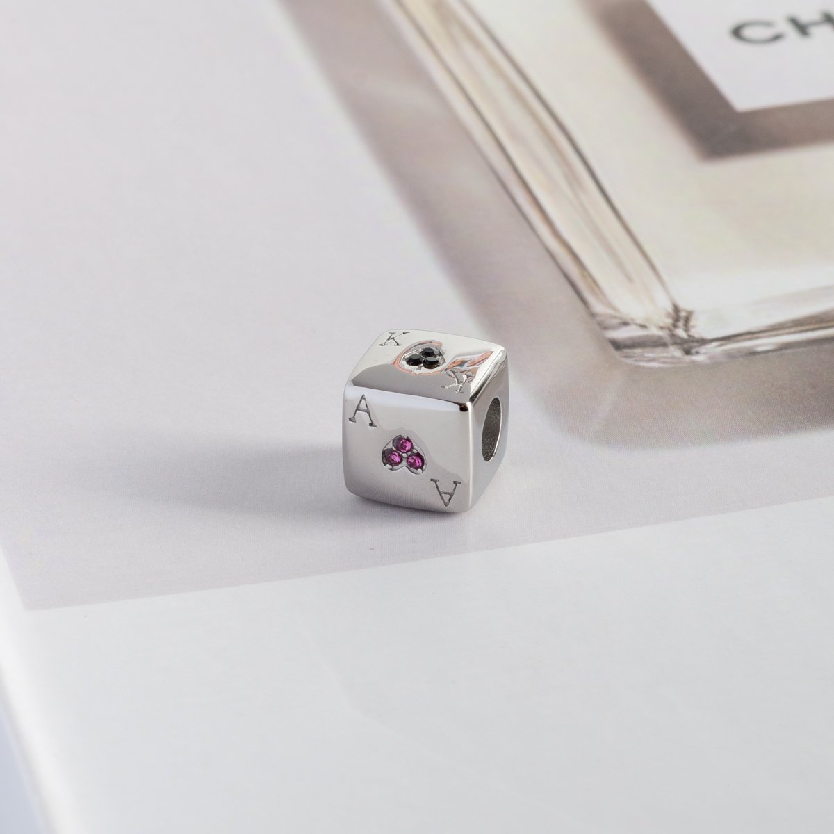 Bq-125-Aço Inox Berloque Dado De Baralho Rosa.