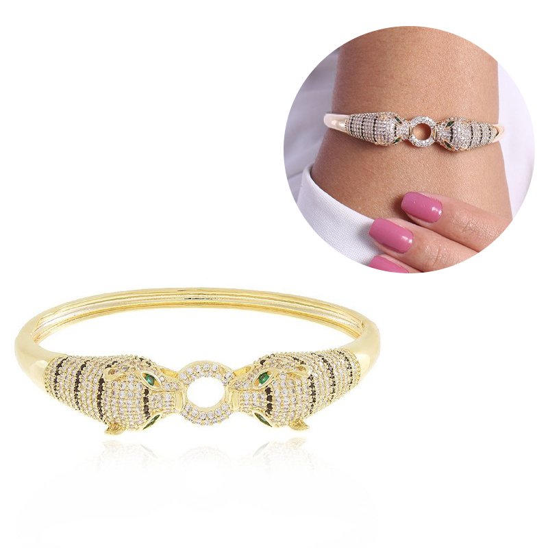 Bracelete guepardo duplo cravejado com micro zircônias.Dimensões: / Peso: - Peso: 23,5gr; Material: - Latão banhado a Ouro 18k.
