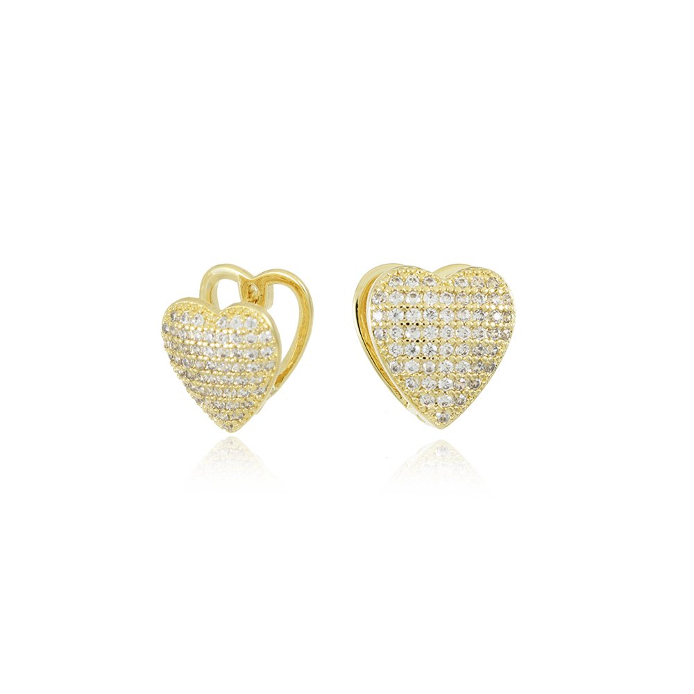 Encante-se com esse brinco!Este lindo brinco DE CORAÇÃO CRAVEJADO DE ZIRCÔNIAS CRISTAL é feito com LATÃO BANHADO A OURO 18K de alta qualidade.
