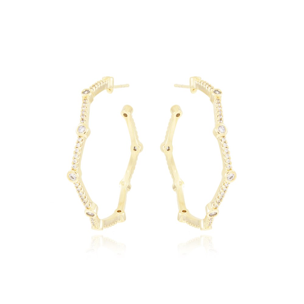 Encante-se com esse brinco!Este lindo brinco MEIA ARGOLA CRAVEJADO é feito com LATÃO BANHADO A OURO 18K de alta qualidade.