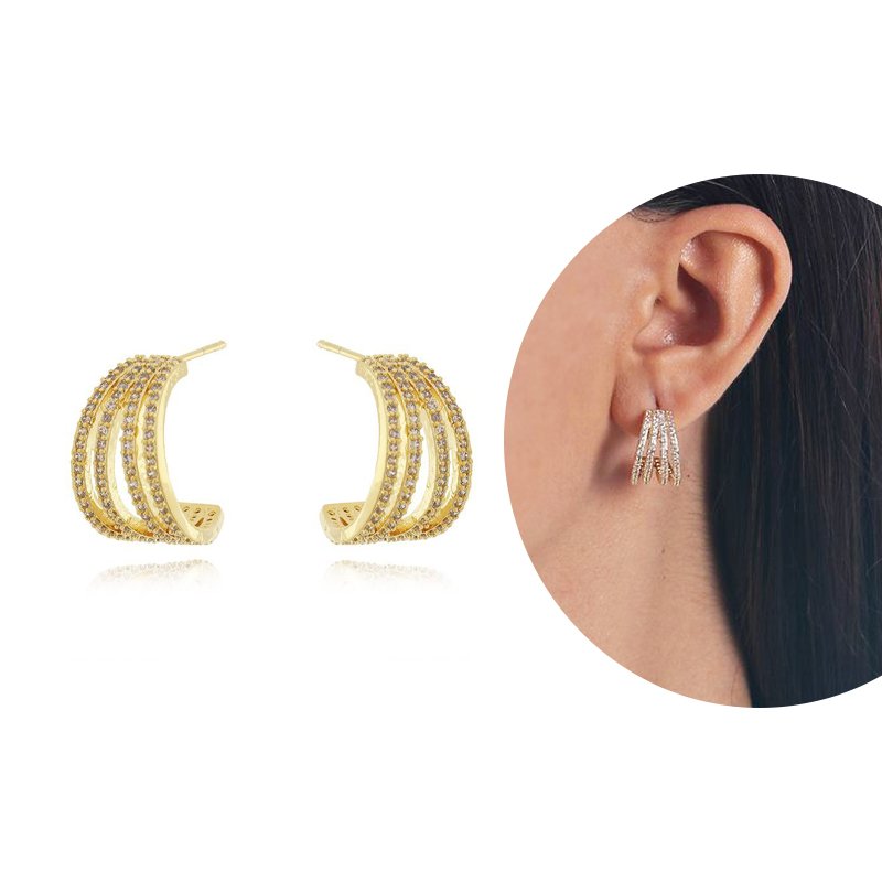 Brinco meia argola de fileiras cravejadas.