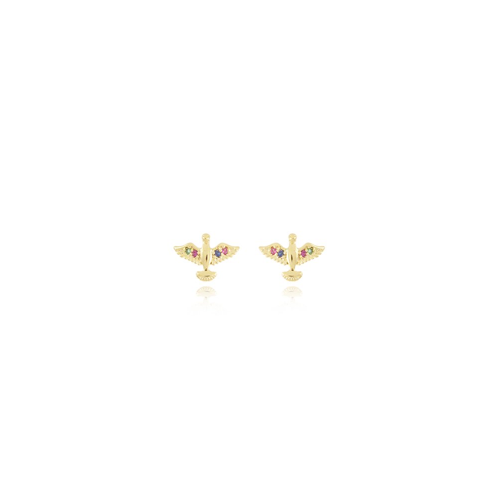 Encante-se com esse brinco!Este lindo brinco BRINCO ESPÍRITO SANTO CRAVEJADO DE ZIRCÔNIAS COLORIDAS é feito com LATÃO BANHADO A OURO 18K de alta qualidade.