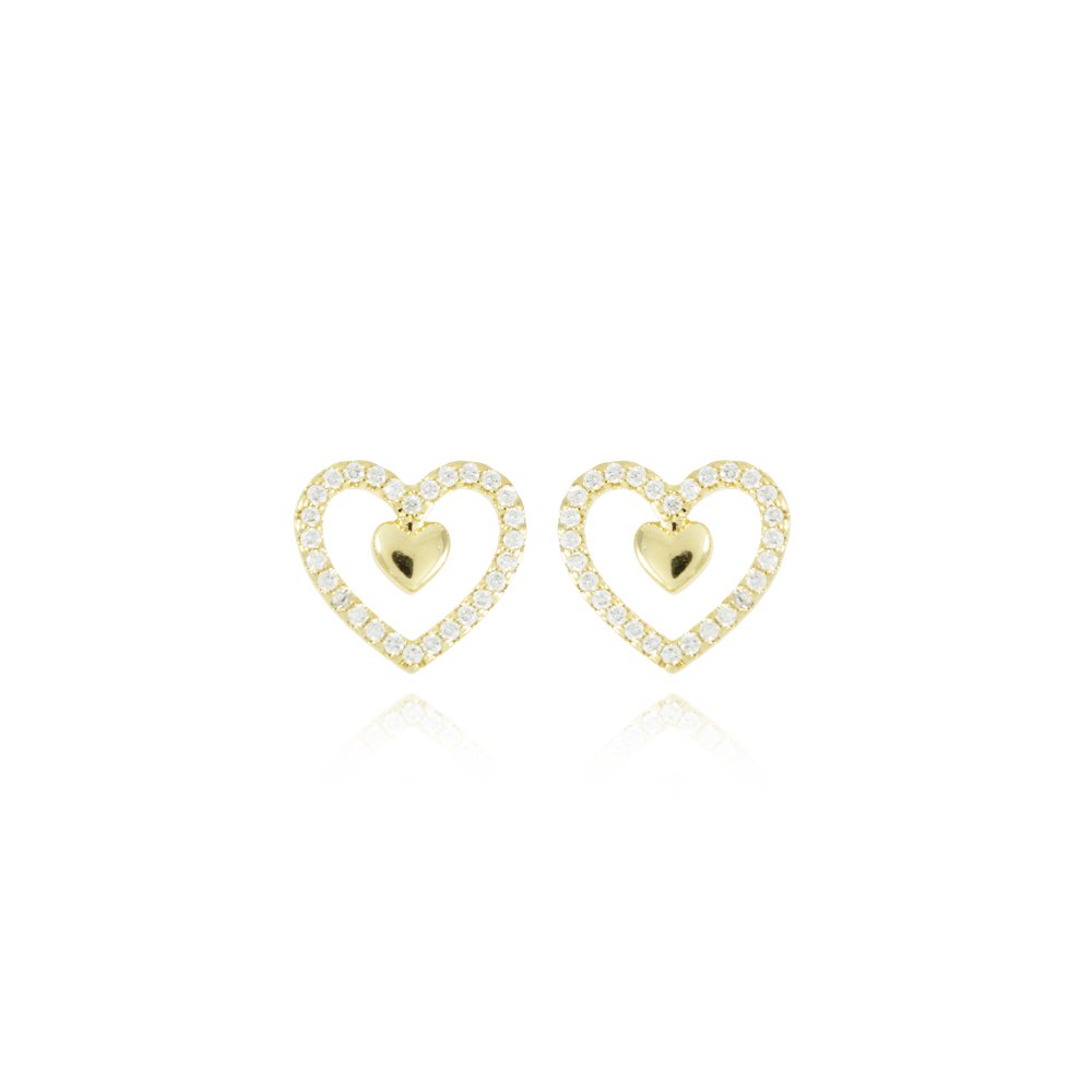 Encante-se com esse brinco!Este lindo brinco DE CORAÇÃO CRAVEJADO VAZADO COM CORAÇÃO LISO é feito com LATÃO BANHADO A OURO 18K de alta qualidade.