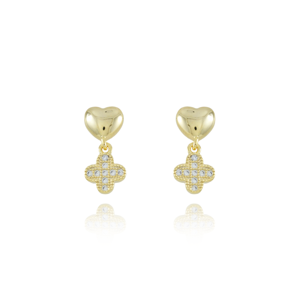 Encante-se com esse brinco!Este lindo brinco DE CORAÇÃO COM TREVO CRISTAL é feito com LATÃO BANHADO A OURO 18K de alta qualidade.