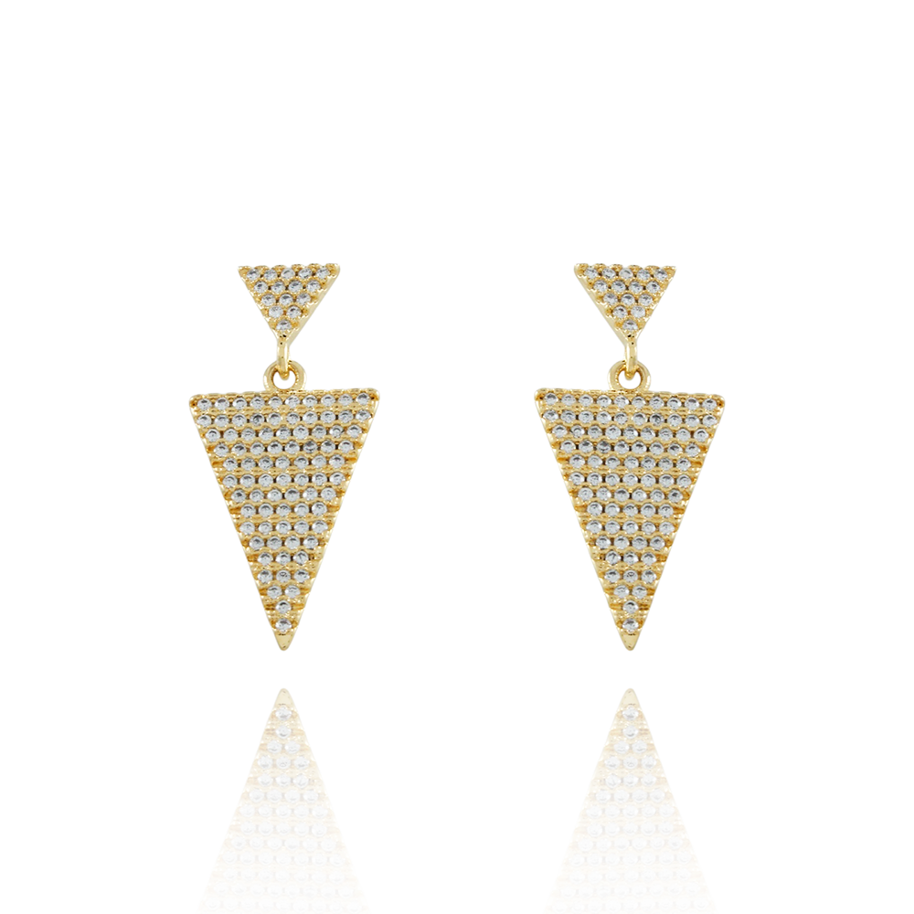 Encante-se com esse brinco!Este lindo brinco DE TRIÂNGULO INVERTIDO CRAVEJADO DE ZIRCÔNIAS CRISTAIS é feito com LATÃO BANHADO A OURO 18K de alta qualidade.