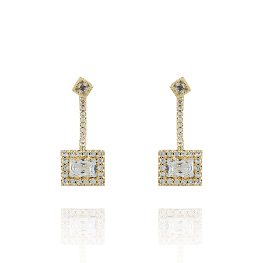 Encante-se com esse brinco!Este lindo brinco QUADRADO CRAVEJADO DE ZIRCÔNIAS CRISTAIS é feito com LATÃO BANHADO A OURO 18K de alta qualidade.