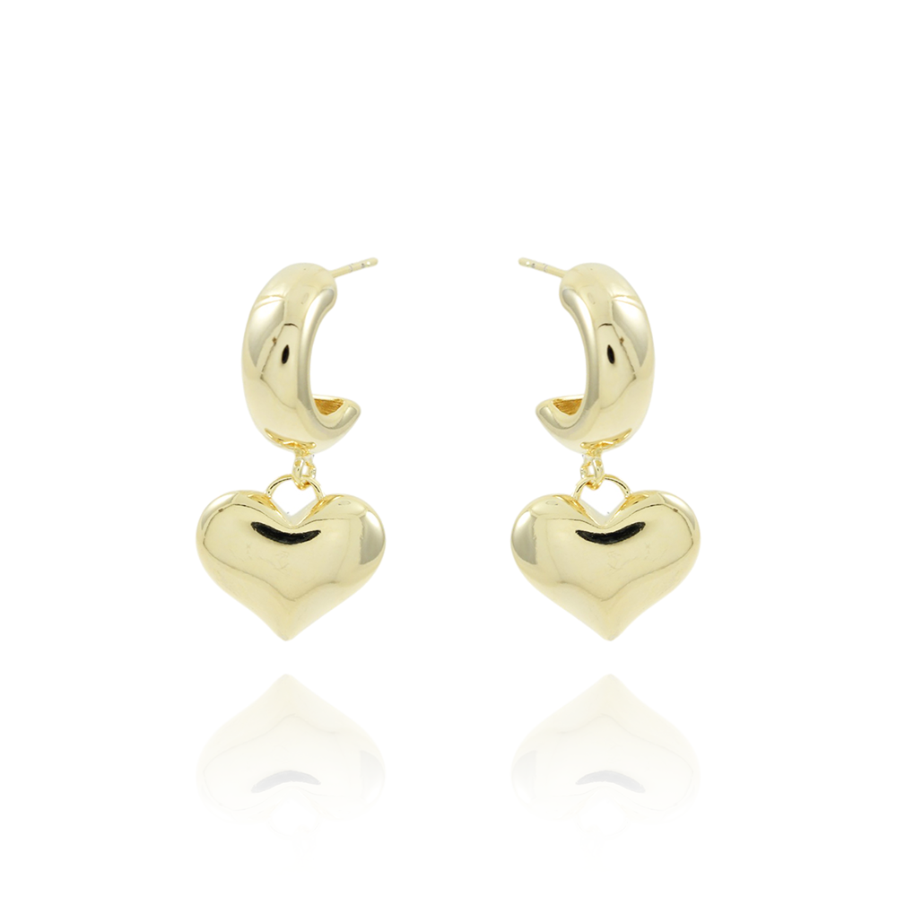 Encante-se com esse brinco!Este lindo brinco MEIA ARGOLA COM PINGENTE DE CORAÇÃO é feito com LATÃO BANHADO A OURO 18K de alta qualidade.