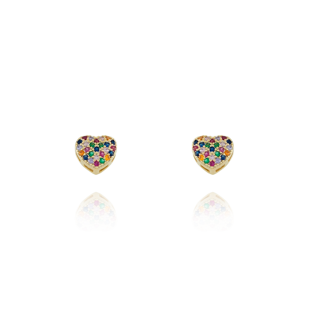 Encante-se com esse brinco!Este lindo brinco DE CORAÇÃO CRAVEJADO COLORIDO é feito com LATÃO BANHADO A OURO 18K de alta qualidade.