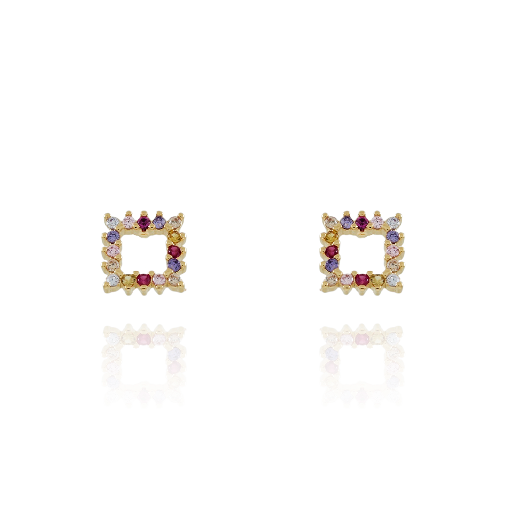 Encante-se com esse brinco!Este lindo brinco QUADRADO CRAVEJADO DE ZIRCÔNIAS COLORIDAS é feito com LATÃO BANHADO A OURO 18K de alta qualidade.