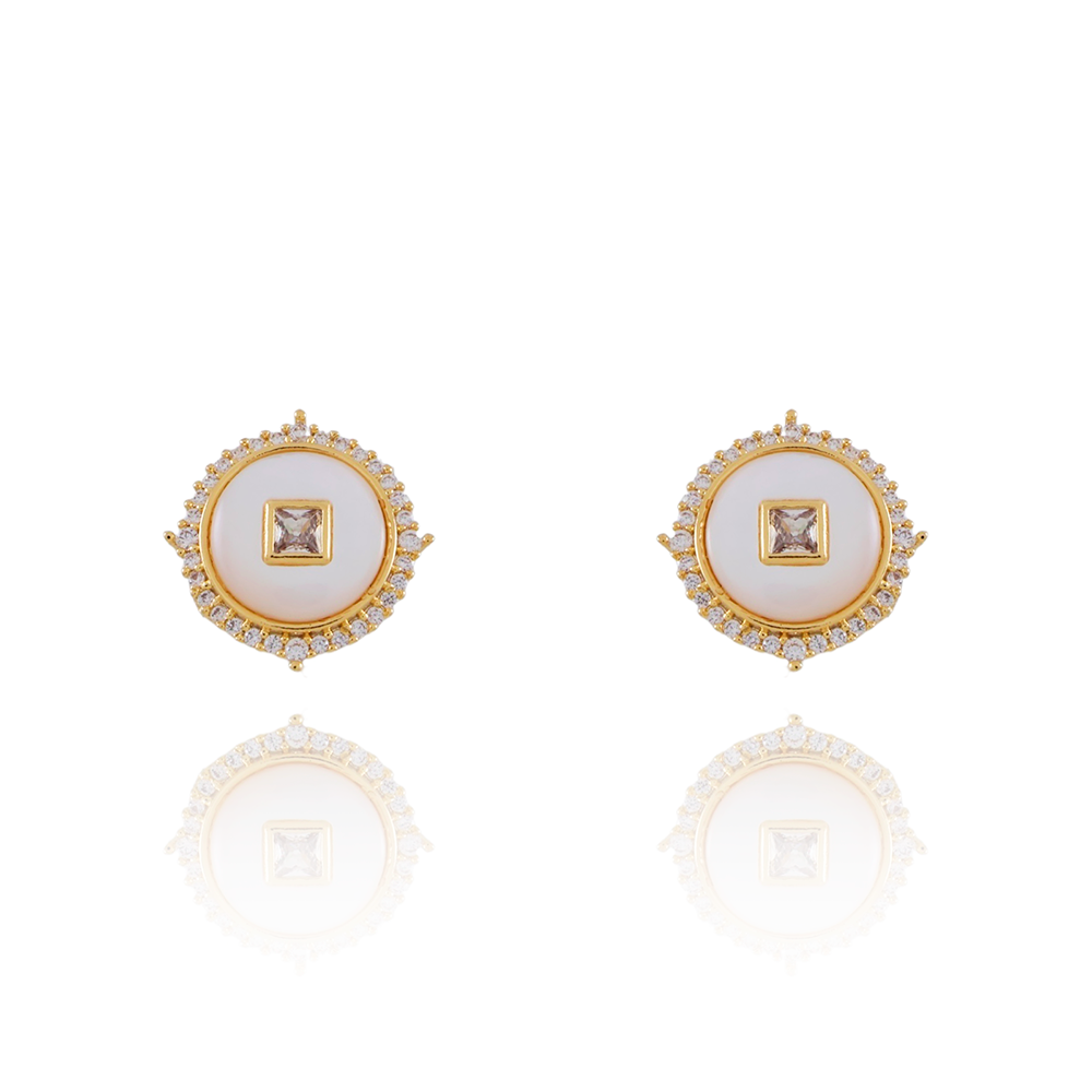 Encante-se com esse brinco!Este lindo brinco REDONDO CRAVEJADO CRISTAL E MADREPÉROLA BRANCA é feito com LATÃO BANHADO A OURO 18K de alta qualidade.