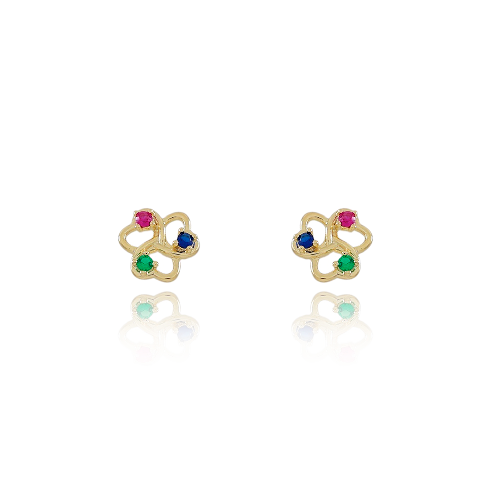 Encante-se com esse brinco!Este lindo brinco DE CORAÇÕES COM ZIRCÔNIAS COLORIDAS é feito com LATÃO BANHADO A OURO 18K de alta qualidade.