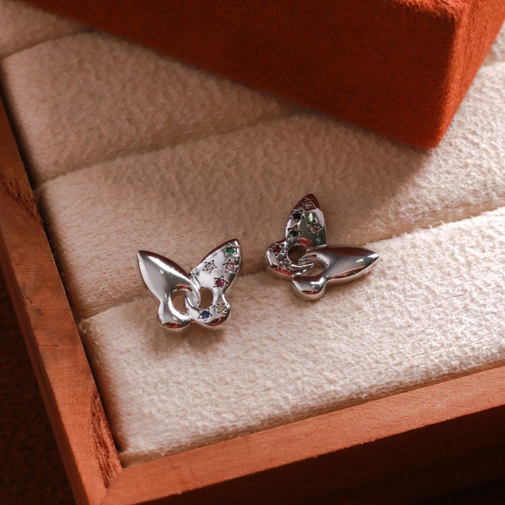 Brf-840-Rd Brinco De Borboleta Cravejado Colorido - Ródio Branco.