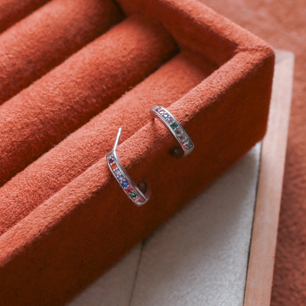Encante-se com esse brinco!Este lindo brinco CRAVEJADO COLORIDO é feito com LATÃO BANHADO A RÓDIO BRANCO de alta qualidade.