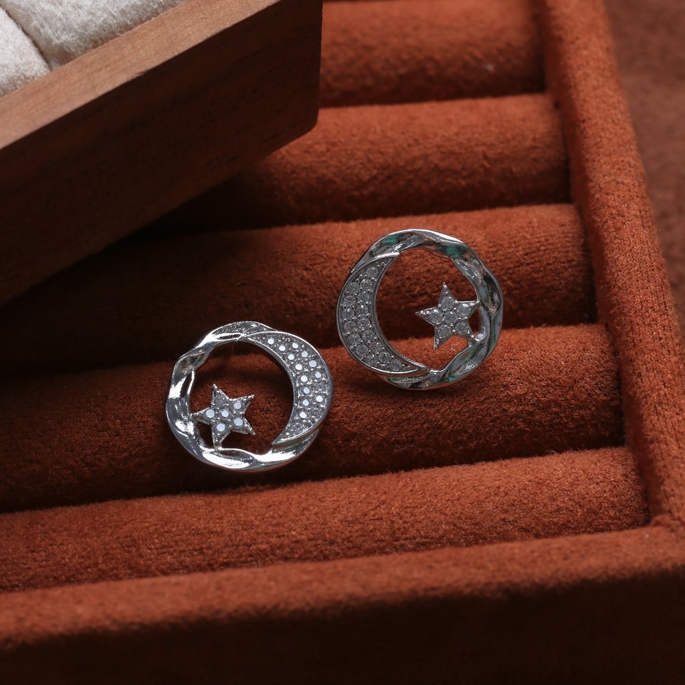 Brf-943-Rd Brinco De Estrela E Lua Cravejado Cristal - Ródio Branco.