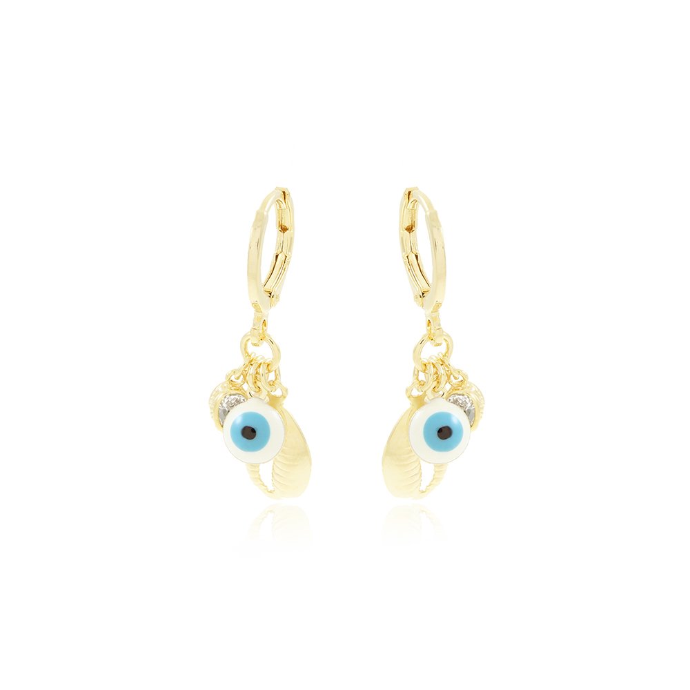 Encante-se com esse brinco!Este lindo brinco DE ARGOLA ARTICULADA COM PINGENTES DE BUZIOS, OLHO GREGO E ZIRCÔNIA é feito com LATÃO BANHADO A OURO 18K de alta qualidade.