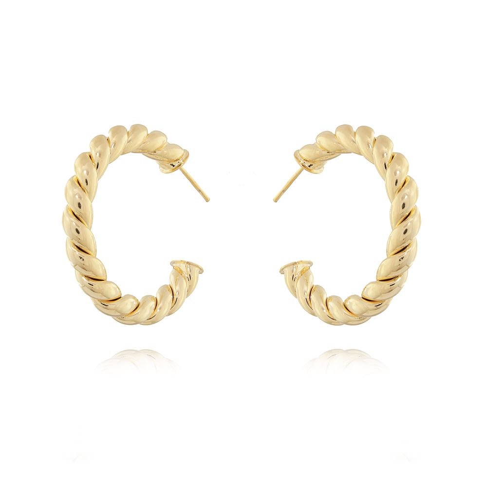 Encante-se com esse brinco!Este lindo brinco de MEIA ARGOLA TORCIDA é feito com LATÃO BANHADO A OURO 18K de alta qualidade.