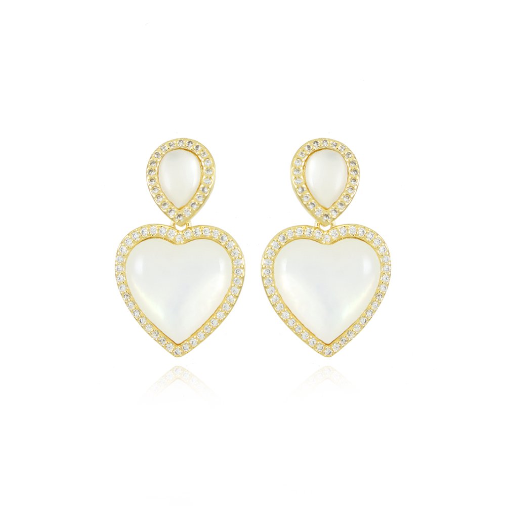 Encante-se com esse brinco!Este lindo brinco CORAÇÃO CRAVEJADO CRISTAL E MADREPÉROLA é feito com LATÃO BANHADO A OURO 18K de alta qualidade.