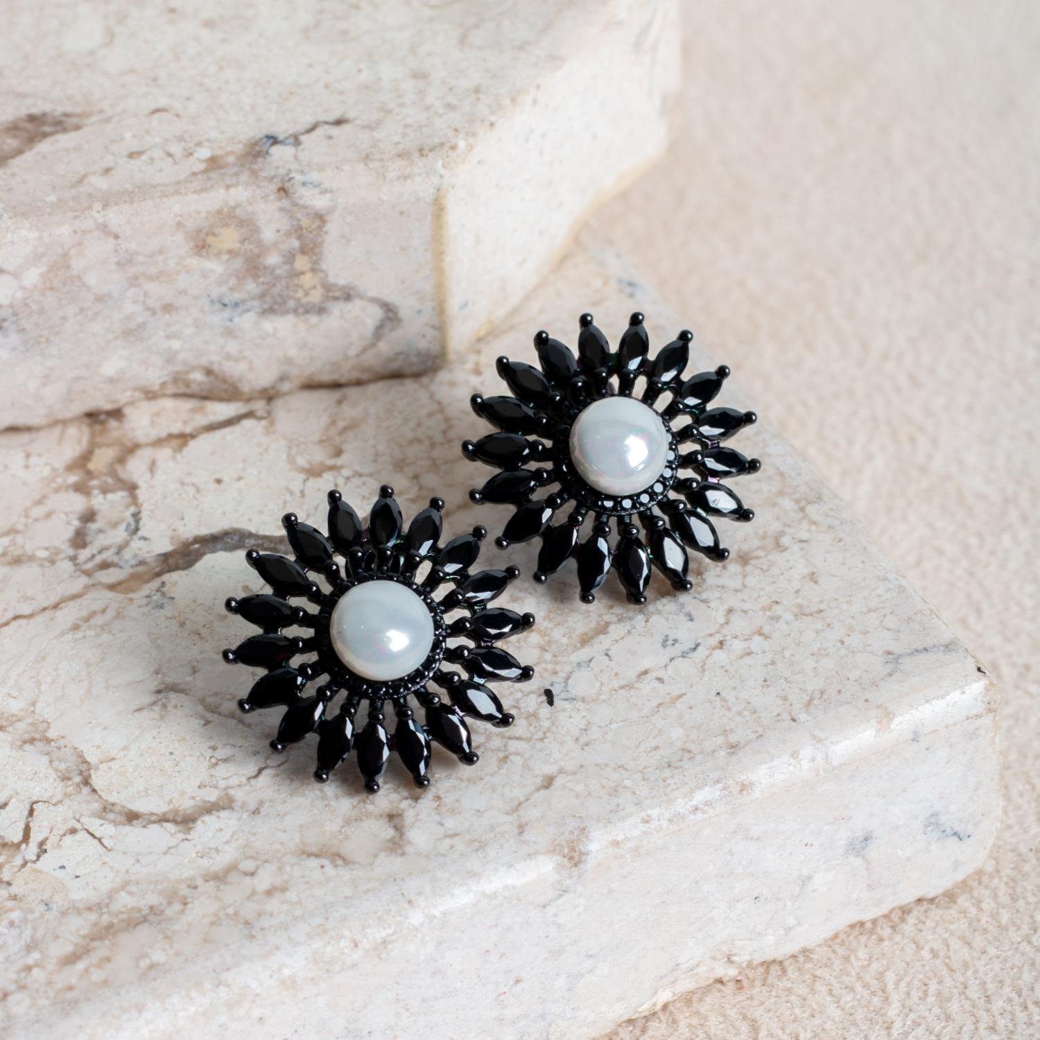Brt-9016-Black Brinco De Flor Com Pérola Preto (Banho Italiano).