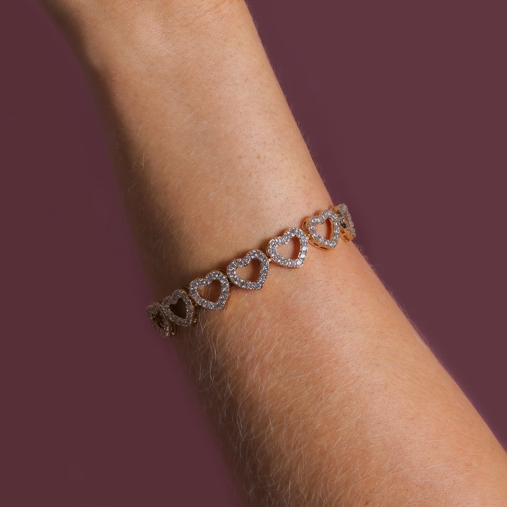 Encante-se com essa pulseira!Esta linda pulseira ELOS DE CORAÇÕES VAZADOS CRAVEJADOS CRISTAIS é feito com LATÃO BANHADO A OURO 18K de alta qualidade.