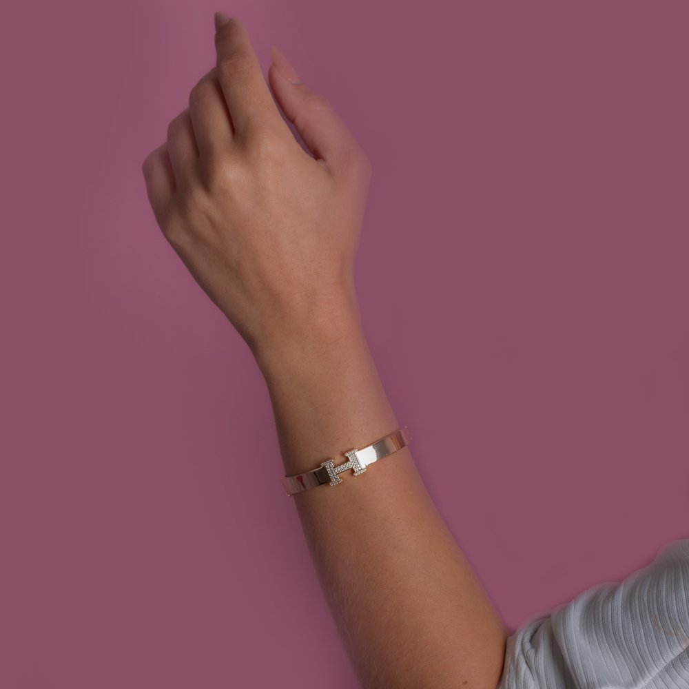 Encante-se com esse bracelete!Este lindo bracelete LISO COM DETALHE CRAVEJADO CRISTAL é feito com LATÃO BANHADO A OURO 18K de alta qualidade.