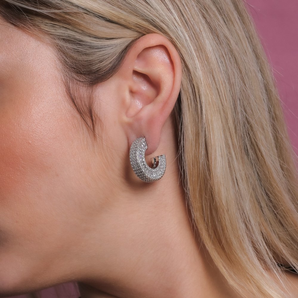 Encante-se com esse brinco!Este lindo brinco MEIA ARGOLA CRAVEJADO DE ZIRCÔNIAS CRISTAIS é feito com LATÃO BANHADO A RÓDIO BRANCO de alta qualidade.