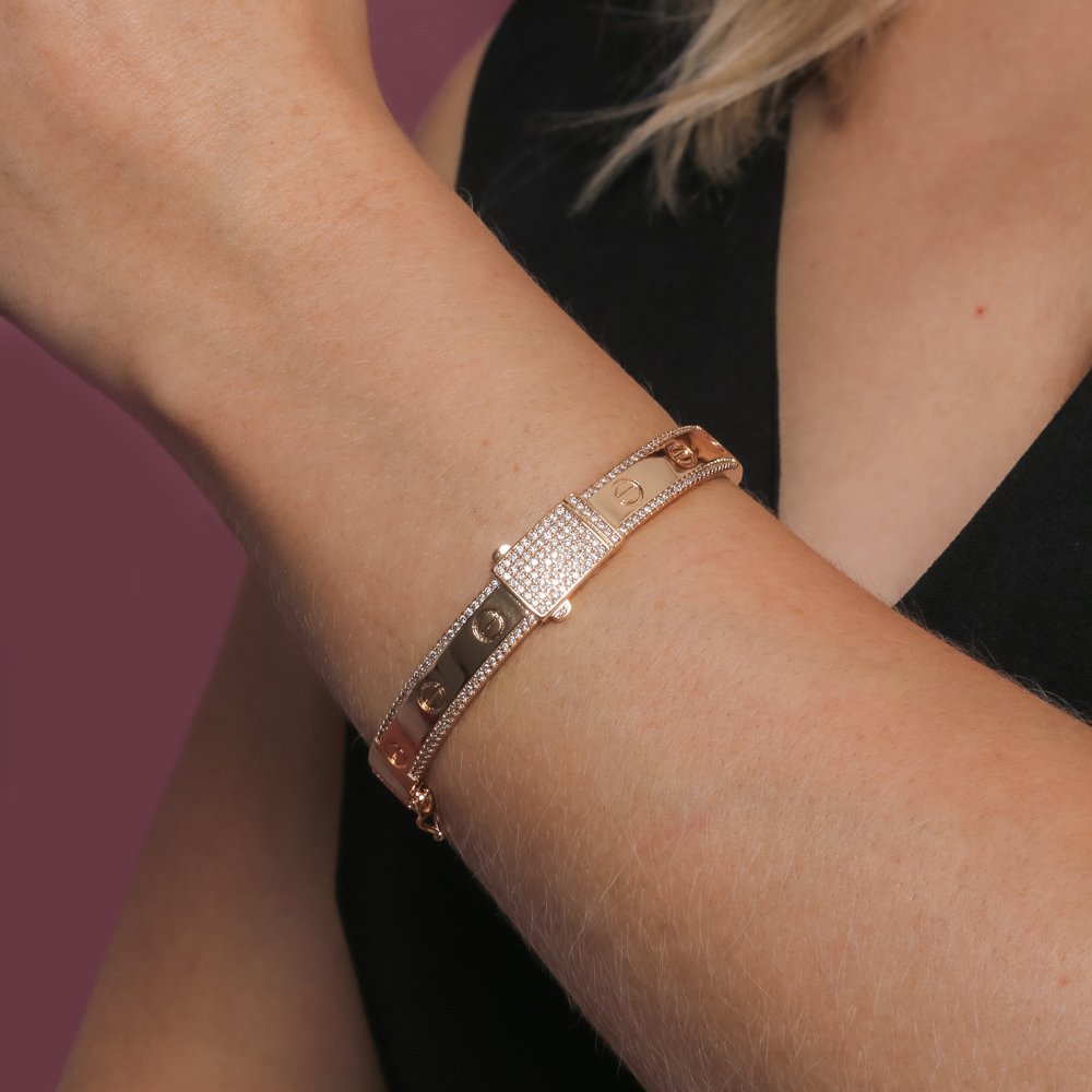 Encante-se com esse bracelete!Este lindo bracelete EM DETALHE CRAVEJADO DE ZIRCÔNIAS CTISTAIS é feito com LATÃO BANHADO A OURO 18K de alta qualidade.