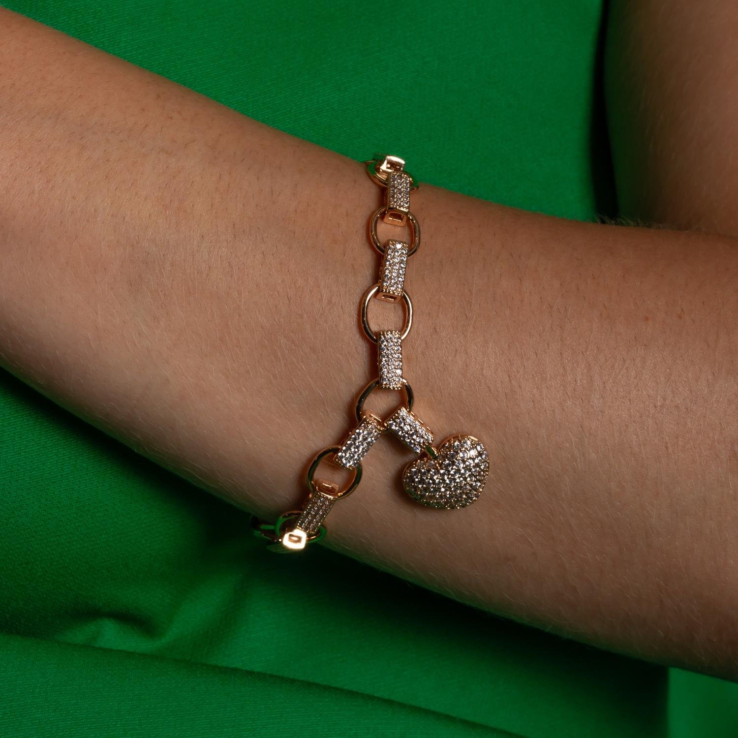 Encante-se com essa pulseira!Esta linda pulseira ELOS E CORAÇÃO CRAVEJADOS CRISTAIS é feita com LATÃO BANHADO A OURO 18K de alta qualidade.