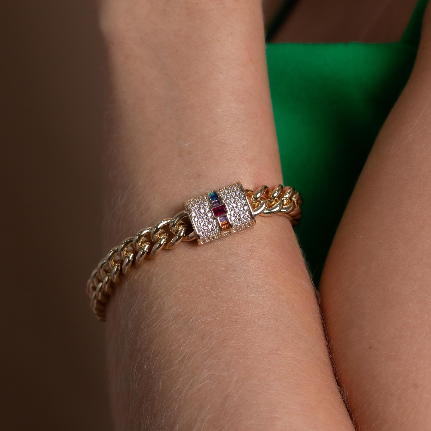 Encante-se com essa pulseira!Esta linda pulseira ELOS CRAVEJADO CRISTAL E COLORIDO é feita com LATÃO BANHADO A OURO 18K de alta qualidade.