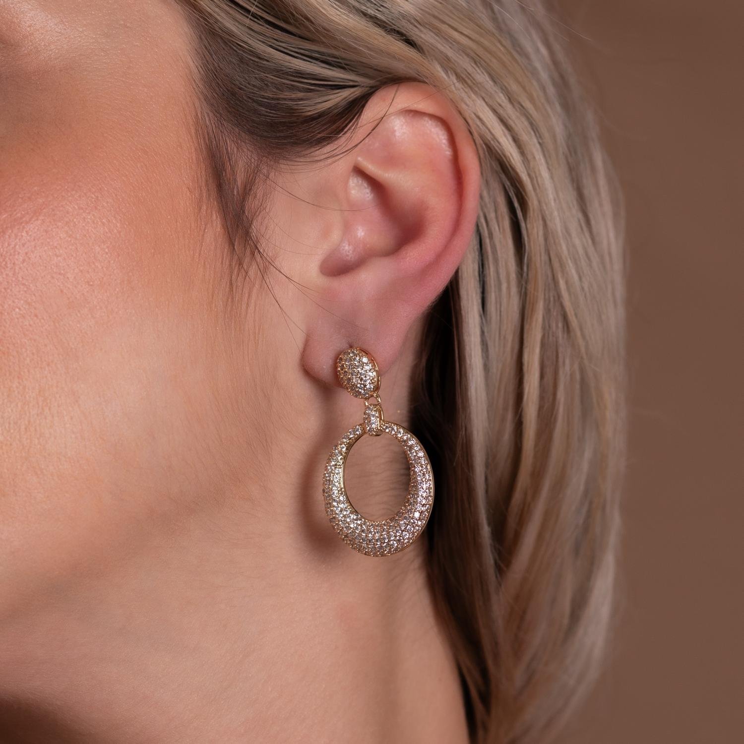 Encante-se com esse brinco!Este lindo brinco MÉDIO CRAVEJADO CRISTAL é feito com LATÃO BANHADO A OURO 18K de alta qualidade.