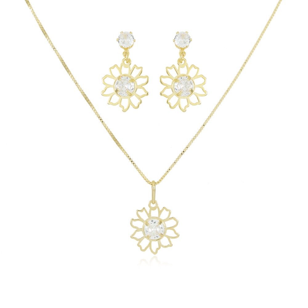 Encante-se com esse conjunto!Este lindo conjunto DE FLOR VAZADA COM ZIRCÔNIA CRISTAL é feito com LATÃO BANHADO A OURO 18K de alta qualidade.