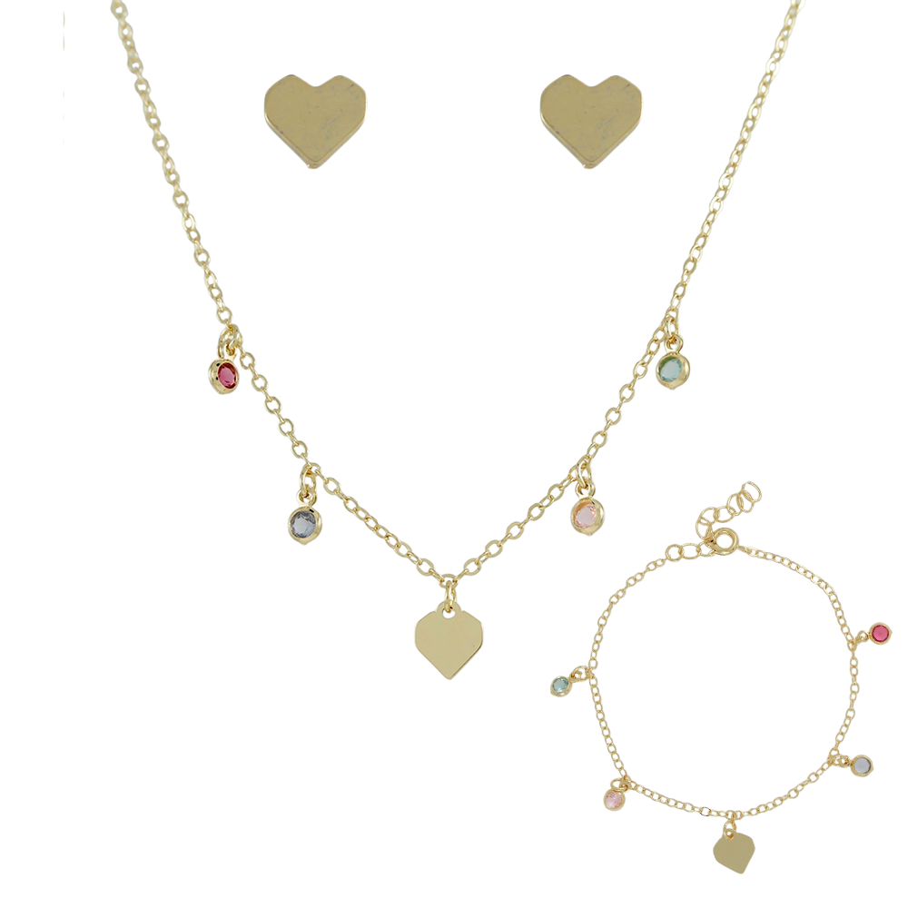 Cjls-3658-Fo Conjunto De Coração Colorido (Brinco + Colar 35cm+5cm + Pulseira).