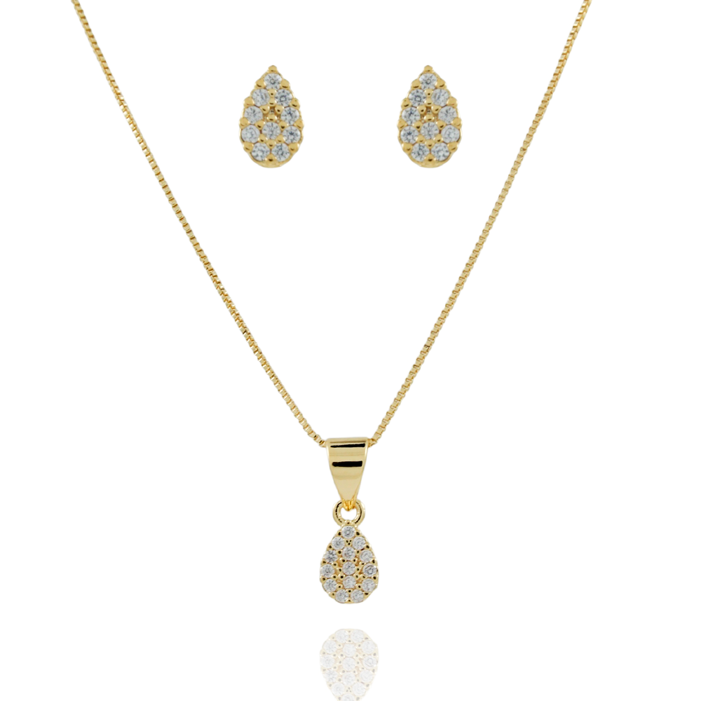 Encante-se com esse conjunto!Este lindo conjunto DE GOTA CRAVEJADO DE ZIRCÔNIAS CRISTAIS é feito com LATÃO BANHADO A OURO 18K de alta qualidade.