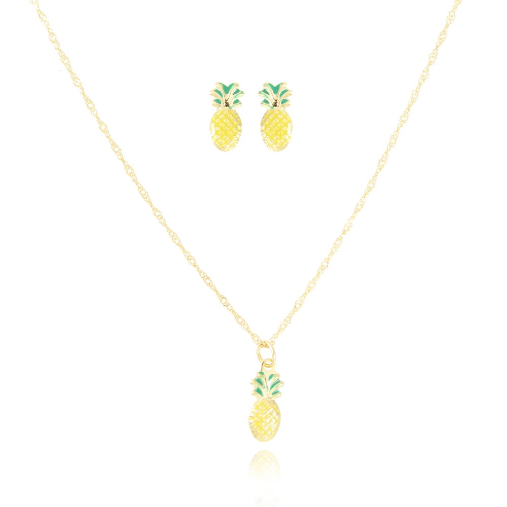 Encante-se com esse conjunto!Este lindo conjunto INFANTIL DE ABACAXI COM RESINA é feito com LATÃO BANHADO A OURO 18K de alta qualidade.