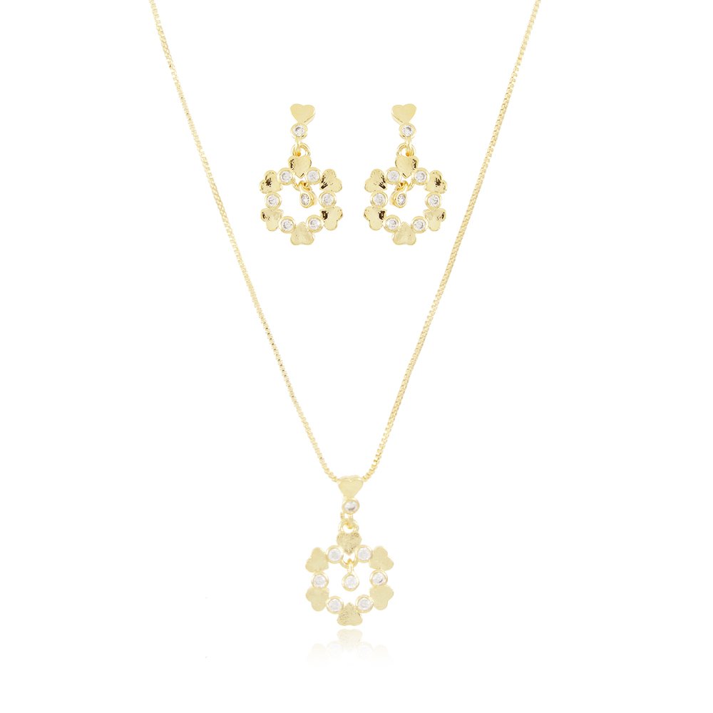 Encante-se com esse conjunto!Este lindo conjunto CRAVEJADO DE ZIRCÔNIAS CRISTAL é feito com LATÃO BANHADO A OURO 18K de alta qualidade.