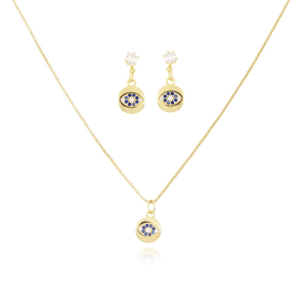 Encante-se com esse conjunto!Este lindo conjunto OLHOP GREGO CRAVEJADO é feito com LATÃO BANHADO A OURO 18K de alta qualidade.